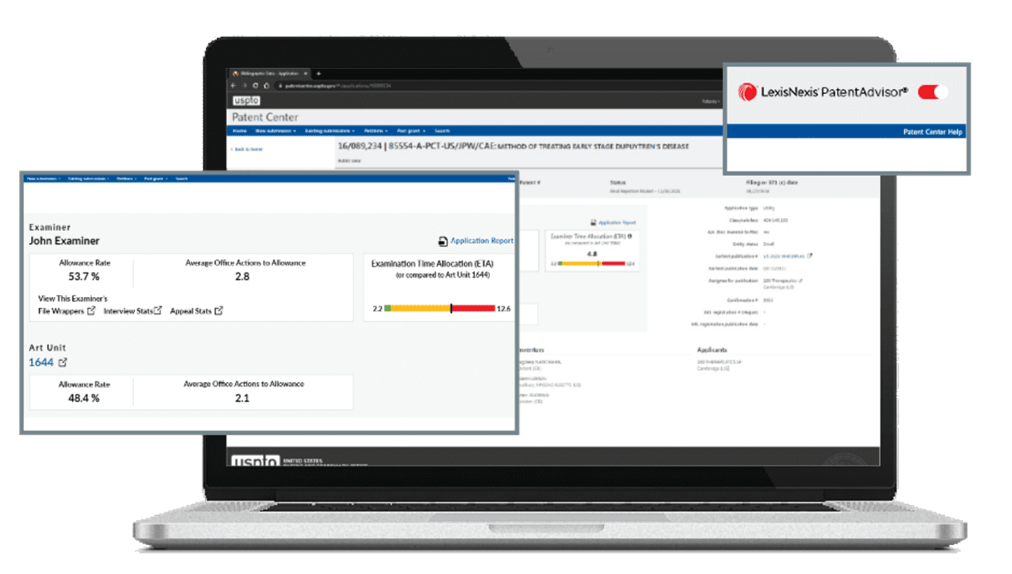 Home > IP Solutions > Patent Prosecution > PatentAdvisor A lawyer or a judge advisor works in the legal concept office. Bring Predictability and Productivity to Your Patent Prosecution Process With LexisNexis PatentAdvisor® REQUEST A MEETING Reduce costs, improve prosecution strategy and deliver stronger outcomes We help you implement the best possible prosecution strategy to achieve success. Predict your patent prosecution outcome with PatentAdvisor™, the most accurate and comprehensive patent analysis software in the industry. Watch the video PatentAdvisor enables you to: Save time and money Access reliable examiner statistics directly in USPTO’s PAIR and Patent Center and identify at-risk applications early on. Efficiently manage your resources Identify cases that require extra management based on a carefully crafted prosecution strategy. Improve prosecution outcomes and stakeholder expectations Powerful examiner analytics enable transparency and predictability. Evaluate the performance of competing firms Measure corporate and law firm prosecution performance against USPTO averages. Prosecution Strategy “The Examiner statistics have been of immense value in planning my prosecution strategy, identifying cases that require extra care and progressing those that have been subjected to further scrutiny” Of counsel, AM Law 200® firm Prosecution Guidance “PatentAdvisor enables me to gauge how difficult an examiner may be and, based on the data, guides me on the best course of prosecution” Partner, Boutique IP Law Firm From patent attorneys, for patent attorneys PatentAdvisor has been developed by patent attorneys, brought to life by IT developers and data scientists, and is constantly enhanced through first-hand feedback from AM Law 100® thought leaders. Streamline your processes and take examiner variability out of the equation Learn how we support your process to drive new efficiencies and bring predictability to prosecution. REQUEST A DEMO Access reliable examiner statistics directly in the USPTO’s PAIR and Patent Center Get immediate access to the most essential examiner and art unit statistics directly on the USPTO’s websites with the free PatentAdvisor™ Extension. Save time switching between applications and guide prosecution strategy, streamline processes, foster more predictable outcomes and build trust among your stakeholders. Available on Chrome™, Firefox®, and Microsoft Edge®. DOWNLOAD the extension Mixed Race businesswoman working at computer Get a complete bird’s eye view of a patent application Understanding the path to patent approval is difficult, sometimes spanning years and multiple attorneys. The PatentAdvisor QuickPAIR timeline design provides a complete visualization of the prosecution process of a patent application, including quick access to all associated office actions and appeal documents. Get immediate “bird’s eye view” of the prosecution lifecycle for any application to save time and increase comprehension Quickly open important documents without searching through the long list of IFW documents Use the “window of opportunity” to strategize how long an application’s prosecution might take Learn more about this feature Predict the likelihood of winning the examiner lottery and identify high-risk cases Tailor your patent application to target the most favorable tech center group and predict the likelihood of being assigned to a specific type of examiner with the LexisNexis PatentAdvisor® Examiner Lottery Framework™. Identify target tech center groups with a higher chance for a favorable examiner using the Tech Center Navigator (formerly PathWays™). Infer the current makeup of patent examiners (most to least favorable) in an art unit with the ETA Distribution™. Identify the probability of being assigned to a specific type of examiner using the Lottery Map™ feature. Predict the type and quantity of rejections and the likelihood of a grant based on statistical models in QuickPAIR. explore the feature Anticipate an examiner’s behavior for better prosecution outcomes Now you can easily, and with more accuracy than ever, predict your assigned examiner’s behavior. With variability at every level of the USPTO, use Examiner Time Allocation (PatentAdvisor ETA™) to visually see how efficient or inefficient your assigned examiner works and tailor your prosecution strategy accordingly. Examiner Time Allocation (PatentAdvisor ETA™) is a more reliable predictor of an examiner’s behavior than allowance rate because it: Includes all pending applications Factors how long the examiner has been at the patent office Is driven by the examiner’s behaviors, not by the filer’s actions Discover ETA Appeal or not? Find the winning arguments With access to valuable historical ex parte appeals information, PTAB Decisions makes LexisNexis the only prosecution analytics platform with more than 124,000 pre-grant decisions tagged to 227 legal issues supporting data-driven decision making, reducing prosecution and leading to higher quality patents. Learn More Benchmark your own or your law firm’s prosecution performance and win new clients Quickly create insightful data-backed reports on prosecution performance with the PatentAdvisor™ Business Development & Analysis feature. Create reports that: Take examiner difficulty out of the equation and score purely for prosecution efficiency based on the proprietary PatentAdvisor™ Efficiency Score Compare and benchmark your prosecution performance against that of your peers Are based on objective prosecution performance metrics as opposed to examiner efficiency Justify external legal spend to stakeholders and demonstrate value to clients Learn More Find patent licensing opportunities based on examiner citation analytics Proactively identify licensing opportunities, infringement risks, and ways to maximize portfolio value with the new PatentAdvisor™ Examiner Rejection Analysis. Utilize power