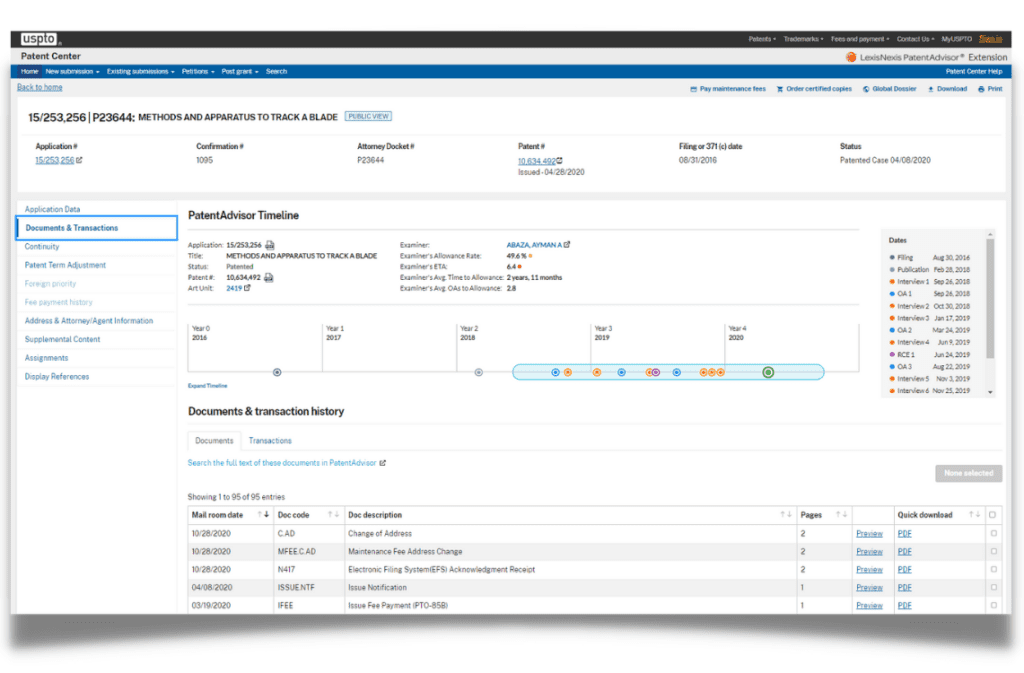 Home > IP Solutions > Patent Prosecution > PatentAdvisor > PatentAdvisor Extension Access Reliable Examiner Statistics Directly in USPTO Patent Center and Private PAIR With the FREE PatentAdvisorTM Extension GET IT NOW Sign Up for Free The free LexisNexis PatentAdvisor® Extension streamlines your patent prosecution workflow by providing reliable information right at the point of need on the USPTO’s Patent Center and Private PAIR websites. No payment or cancellation is required. Get it now USPTO Patent Center without PatentAdvisor Extension USPTO Patent Center with PatentAdvisor Extension Your gateway to free examiner statistics Get immediate access to reliable industry metrics including: Examiner Time Allocation (PatentAdvisor ETATM): the single most informative metric for predicting Patent Examiner behavior Examiner Allowance Rate Art Unit Allowance Rate The average number of office actions to allowance for both Examiner and Art Unit Visualize your prosecution timeline and get quick access to important documents The PatentAdvisor Extension gives PatentAdvisor users access to the QuickPAIR timeline, bringing a bird’s eye view of any patent application right in Patent Center and Private PAIR. Save time with easier access to important documents right in your workflow. Experience PAIR and Patent Center in a Totally New Way Streamline processes Enhance your workflow with critical information right where you need it. Efficiently manage resources and stakeholders’ expectations Insights enable you to predict the likely length and cost of prosecution. Save time and money Get relevant data at the point of need to help identify at-risk applications early-on. Experience the power of advanced patent prosecution data Available in Google Chrome, Microsoft Edge, and Mozilla Firefox Sign up for access to the PatentAdvisor Extension Your gateway to free examiner statistics in Patent Center and Private PAIR No payment or cancellation required Already a Customer? Sign In Related Resources Apply Qualitative Data to Your Patent Prosecution StrategyPatent prosecution strategy can benefit from quantitative and qualitative data. The best approach is to consider all available information.Read more NEW: Access Examiner Analytics from the USPTO Patent Center and Private PAIR WebsitesGain convenient access to patent statistics directly on the USPTO Patent Center and Private PAIR websites with LexisNexis PatentAdvisor®.Read more How Ex Parte PTAB Decision Data Helps to Streamline Prosecution ProcessesPTAB Decision data reveals the substance behind the statistics to guide specific response strategy and insights.Read more Use Patent Data to Understand USPTO ExaminersLexisNexis PatentAdvisor® users can understand USPTO examiners and predict the course of prosecution and the examiner’s decisions.Read more Grab the fact sheet Click below to access and download a PDF to share with team members and decision-makers. Download it now More Recommended Solutions Pensive young beautiful businesswoman in glasses working on laptop and keeping hand on chin while sitting at her working place Application Drafting Write high-quality patents with precision using LexisNexis® PatentOptimizer®. Create consistent, accurate, and more informed office action responses that reduce human error, manually intensive activities, and overall costs. Learn More Patent Prosecution Become a more effective IP manager with LexisNexis® PatentAdvisor®. We help you implement the best possible prosecution strategy to achieve success. Predict your patent prosecution outcome with the most accurate and comprehensive patent analysis software in the industry. Learn More Phishing, mobile phone hacker or cyber scam concept. Password and login pass code in smartphone. Online security threat and fraud. Female scammer with cellphone and laptop. Bank account security. Brand Protection Protect your brand and safeguard your customers from global, systemic IP infringement with LexisNexis® Brand Protection powered by Appdetex. Efficiently identify and investigate high-value targets, no matter where and how they are operating. Learn More
